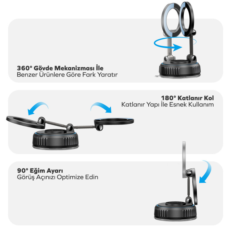 360° Dönebilir ve Katlanabilir: Woyax araç içi telefon tutucu, 360° dönebilen başlığı ve katlanıp eğilebilen çift eksenli metal kolu sayesinde diğer benzer ürünlerden ayrışır telefonunuzu tek hareketle ideal görüş açısına getirir.