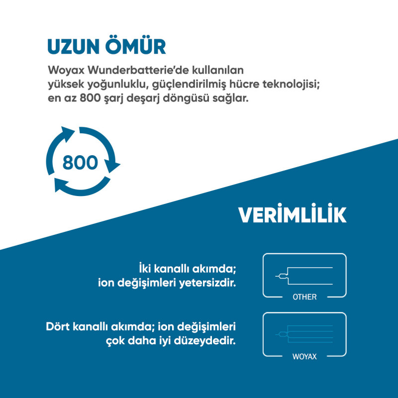 Eski tek katmanlı pil hücreleri yerine kullanılan, yeni yoğunlaştırılmış ve güçlendirilmiş çift katmanlı Li-ion pil hücreleri ile daha uzun ömür.