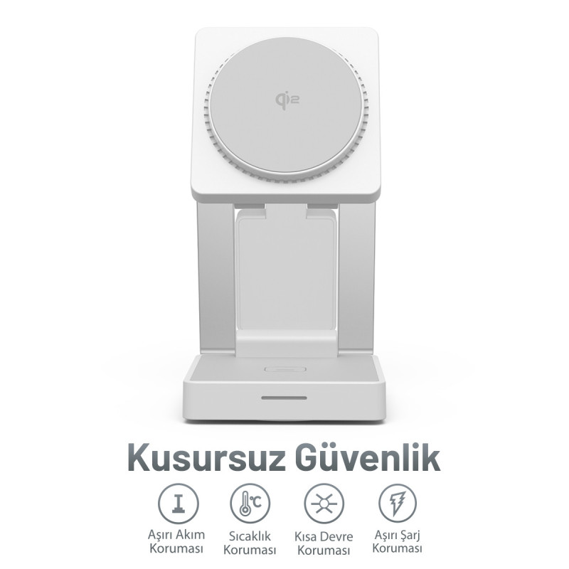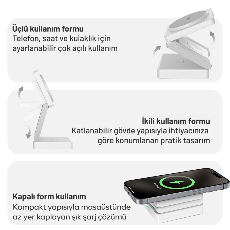 MagSafe destekli iPhone modelleri, Apple Watch serileri ve kablosuz şarj destekli AirPods modelleriyle uyumlu çalışarak tek noktadan düzenli şarj imkânı sunar.